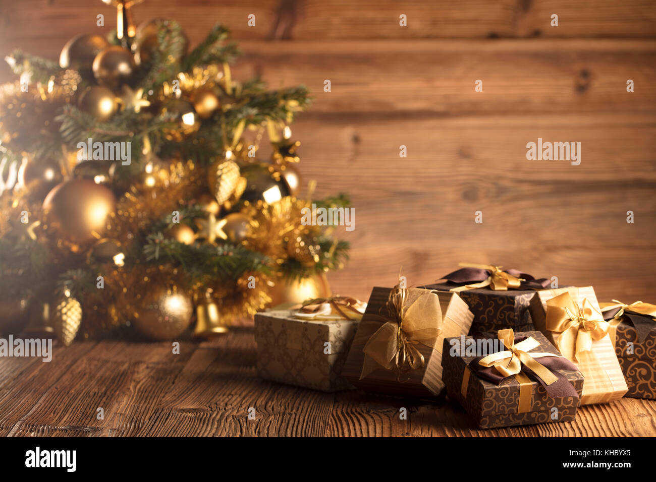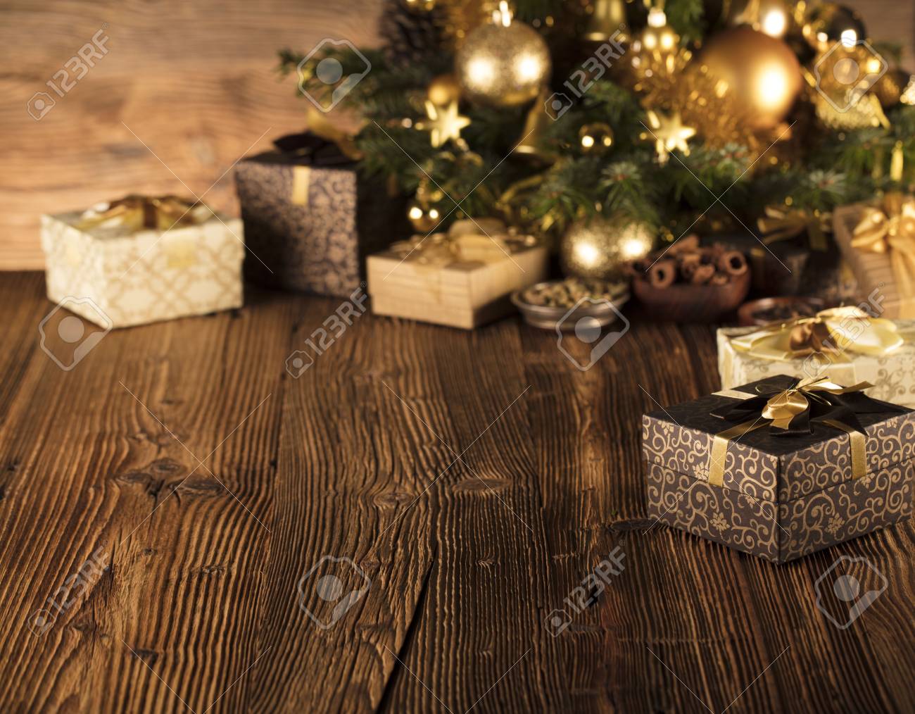 Christmas Decoration In Golden And Brownish Aesthetics With Presents
