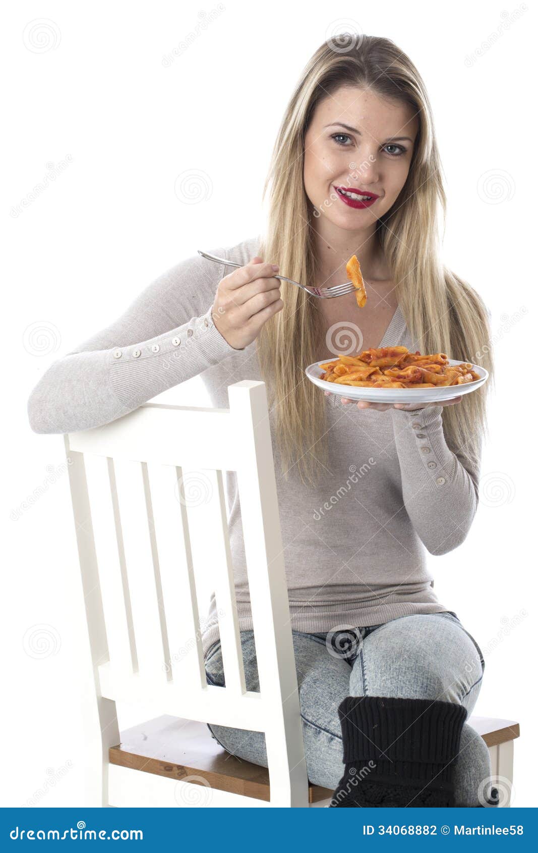 Young Woman Eating Penne Pasta Stock Photo Image Of White