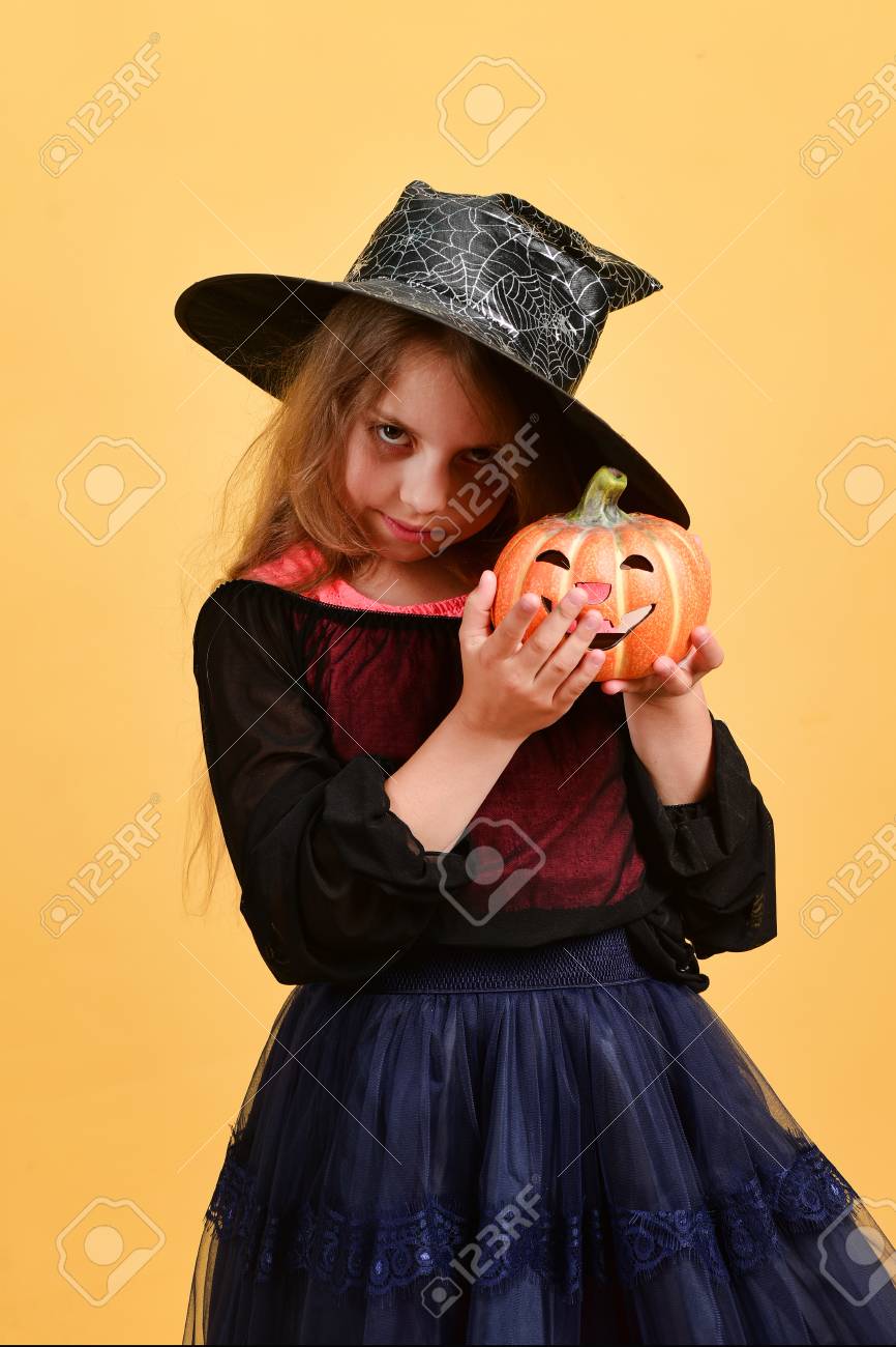 Girl With Carved Orange Pumpkin Isolated On Warm Yellow Background