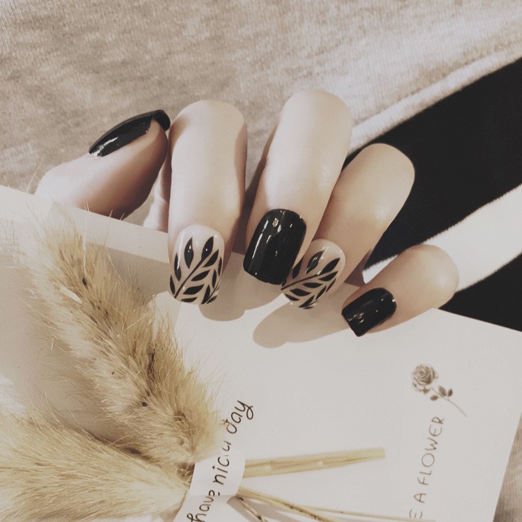 24pcs False Fake Finger Nails French Acrylic Square Black Leaf