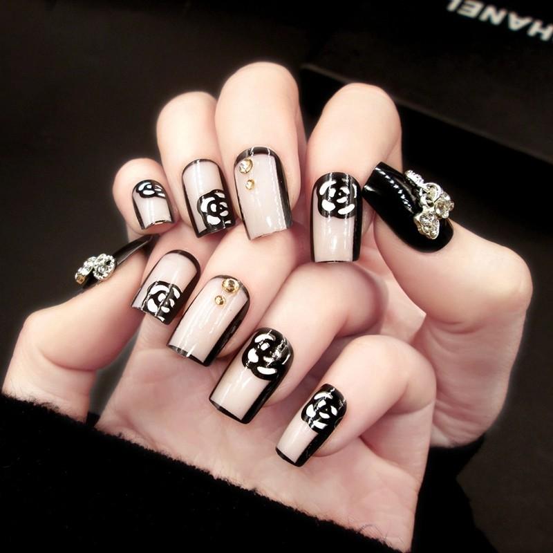 Square Acrylic Nails Beige Black Rose Pre Designed Lady Finger